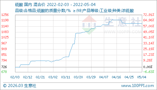 05月04日硫酸1168.33元/噸 60天上漲46.04%