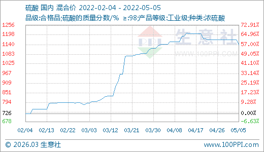 05月05日硫酸1140.00元/噸 60天上漲42.50%