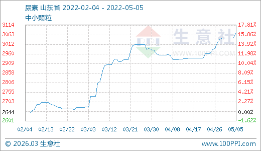 05月05日尿素3072.00元/噸 60天上漲12.45%