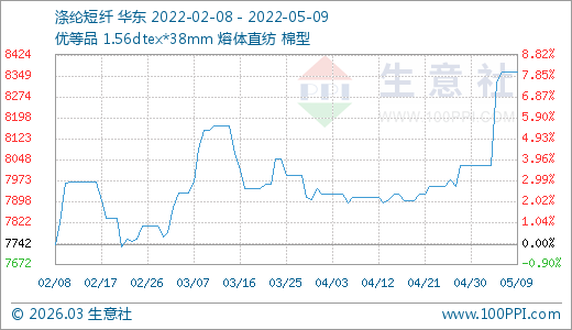 滌綸短纖05月09日最新價格8362.00元/噸,最近5天上漲4.20%。