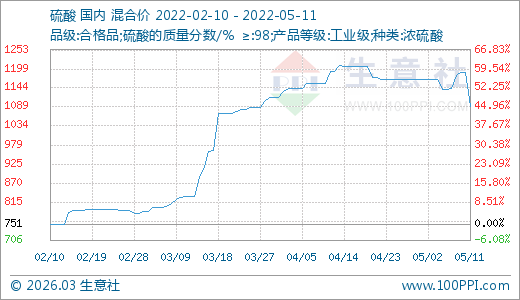 05月11日硫酸1092.00元/噸 60天上漲31.30%