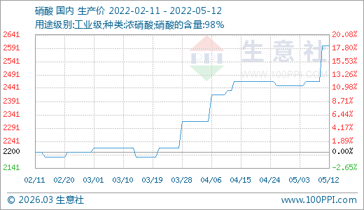 05月12日硝酸2600.00元/噸 5天上漲5.41%