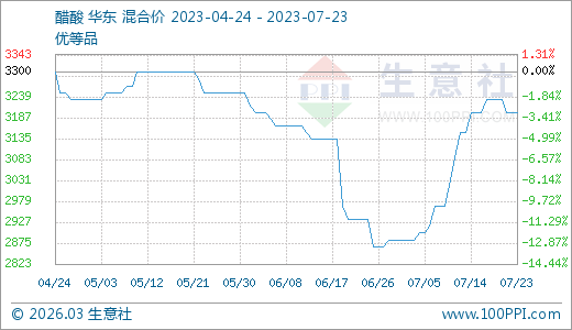 07月23日醋酸3200.00元/噸 15天上漲7.87%