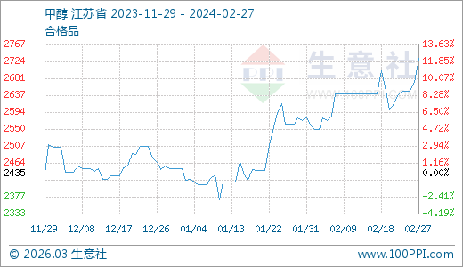 02月27日甲醇2731.67元/噸 5天上漲3.64%