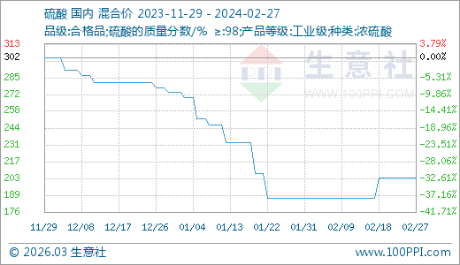 02月27日硫酸203.75元/噸 10天上漲8.67%