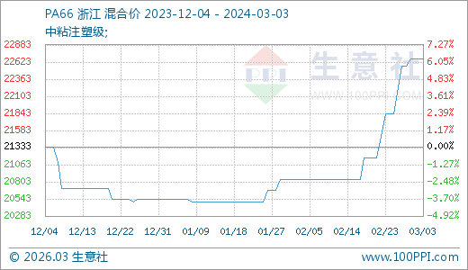 PA66 03月03日最新價格22666.67元/噸,最近10天上漲5.43%,15天上漲8.80%,60天上漲10.39%。