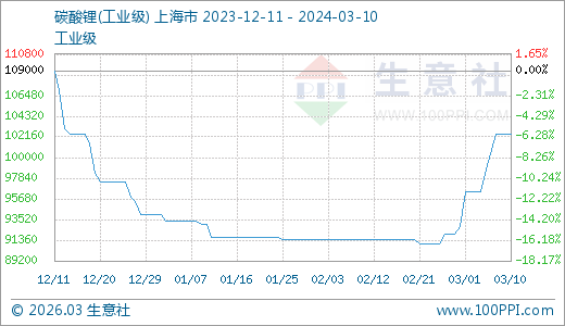 03月10日碳酸鋰102400.00元/噸 5天上漲4.07%