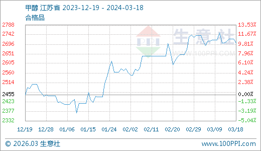 03月18日甲醇2701.67元/噸 60天上漲10.38%