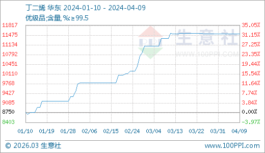 04月09日丁二烯11525.00元/噸 60天上漲17.60%