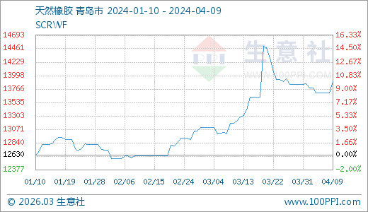 04月09日天然橡膠13890.00元/噸 60天上漲10.15%