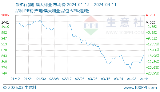 04月11日鐵礦石844.33元/噸 5天上漲4.25%