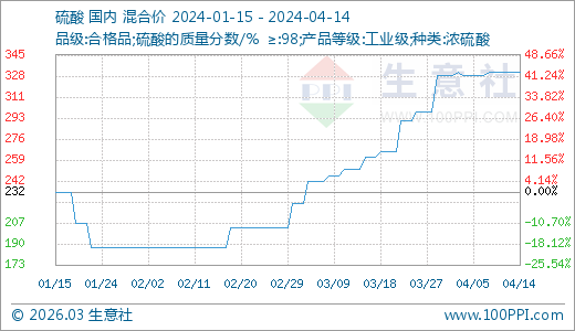 04月14日硫酸331.25元/噸 20天上漲10.88%