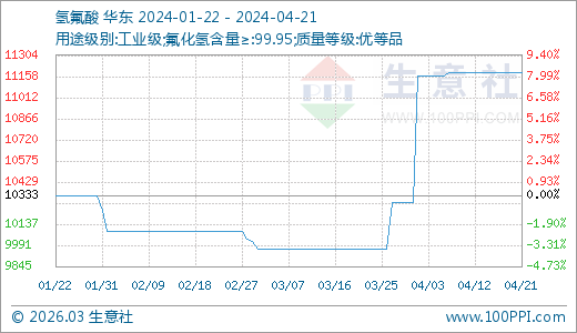 04月21日氫氟酸11183.33元/噸 30天上漲12.21%