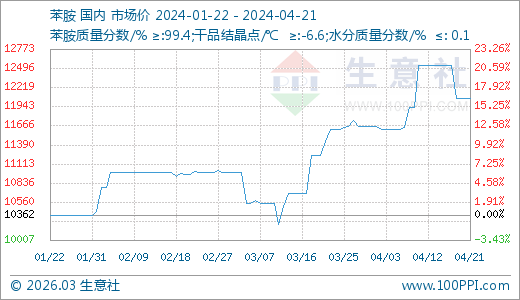苯胺04月21日最新價格12067.50元/噸,最近60天上漲10.08%。
