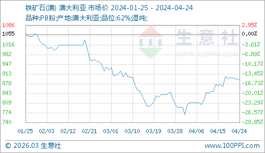 04月24日鐵礦石889.56元/噸 15天上漲8.00%