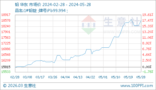 05月28日鉛18610.00元/噸 30天上漲10.64%