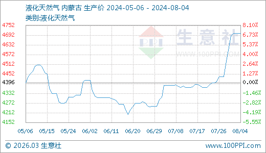 08月04日液化天然氣4702.00元/噸 10天上漲6.77%
