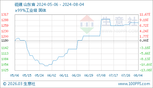 08月04日硫磺1275.00元/噸 60天上漲18.42%