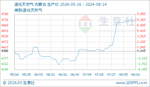 液化天然氣08月14日最新價格4742.00元/噸,最近60天上漲11.21%。
