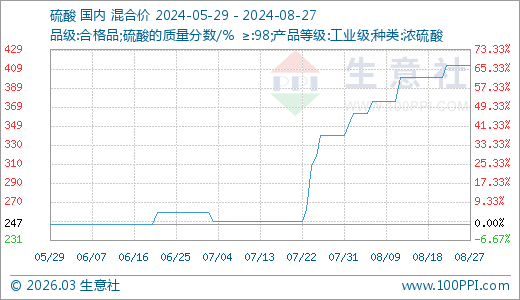 08月27日硫酸412.50元/噸 20天上漲10.00%
