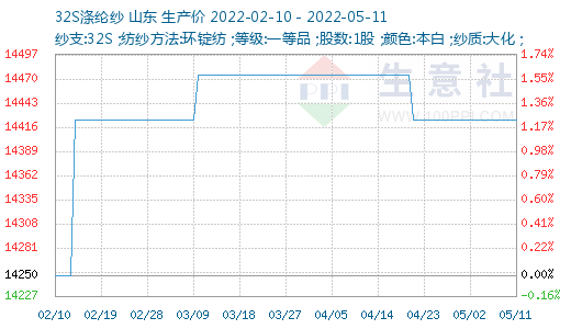 價格:據(jù)生意社數(shù)據(jù)顯示,5月11日山東地區(qū)32S純滌紗均價14425元/噸。