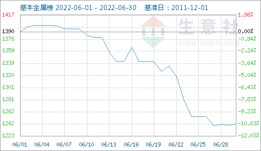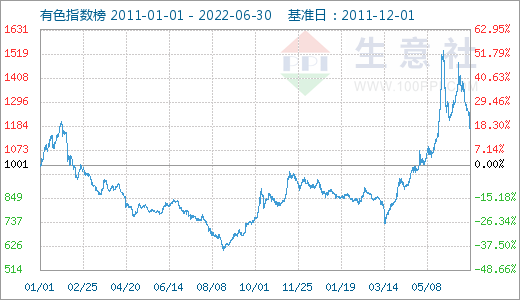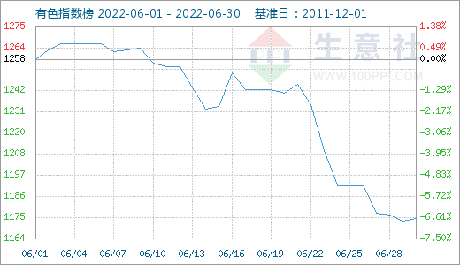 據(jù)生意社數(shù)據(jù)監(jiān)測,6月有色指數(shù)延續(xù)5月的下跌走勢,截止月末,有色指數(shù)收1174點,較月初的1258點下跌6.61%,較年初下跌4.68%,同比下跌11.76%。生意社有色行業(yè)分析師劉美麗指出,今年以來,有色金屬在3月9日達到年內(nèi)最高價后,價格逐漸下移,主要原因是3月開始,國內(nèi)公共衛(wèi)生事件增多,多地封控,市場需求出現(xiàn)疲軟,多地物流運輸受阻,下游加工企業(yè)開工率遠低于去年同期水平,有色價格難有起色。