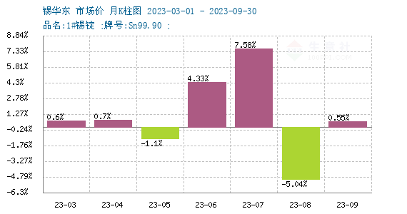 商品價格K柱圖,運(yùn)用價格走勢K線的理念,以柱狀圖形式,反映每周或者每月的價格漲跌變化,投資者可以根據(jù)K柱圖的變化,來進(jìn)行買賣投資。紅色表示:上漲;綠色表示:下跌;K柱高度表示:漲跌幅度。從月度K柱圖可以看出2022年11月后受宏觀因素影響,錫價連續(xù)上漲3個月,自2023年2月價格單月下跌11.35%,近三個月錫價走勢窄幅波動。從周度度K柱圖可以看出錫錠市場近期走勢整體偏弱。