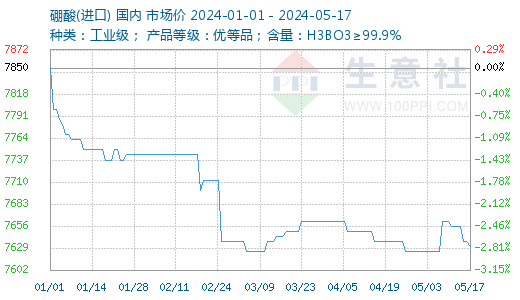 海外進(jìn)口貨源方面,目前進(jìn)口貨源對(duì)外報(bào)價(jià)集中在7500-7800元/噸(不同品牌、不同規(guī)格、產(chǎn)品實(shí)際成交價(jià)以協(xié)商為主)。據(jù)生意社商品行情分析系統(tǒng)顯示,進(jìn)口硼酸市場(chǎng)均價(jià)7631.25元/噸,較4月初市場(chǎng)均價(jià)7662.5元/噸,下跌0.41%。