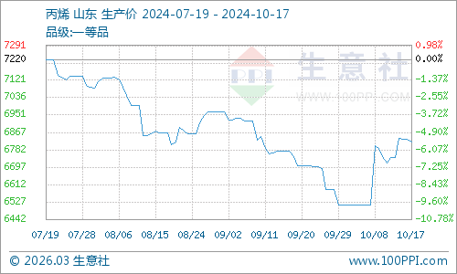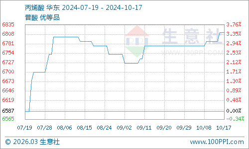 本周市場走勢延續(xù)震蕩上行,周內(nèi)個別工廠裝置負(fù)荷略有調(diào)整,但整體變化不多。受需求酯類產(chǎn)品走勢影響,各地商家報盤價多延續(xù)上漲。用戶采買積極性增加,實單成交重心仍偏向中低端,截至10月17日,生意社丙烯酸基準(zhǔn)價6812.50元/噸,與本月初(6775.00元/噸)相比,上漲了0.55%。