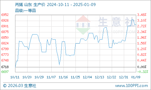 3.原料成本:丙烯是丙烯酸的主要原料,其價(jià)格波動(dòng)直接影響丙烯酸的生產(chǎn)成本。丙烯價(jià)格上漲會(huì)增加丙烯酸的生產(chǎn)成本,從而推高市場(chǎng)價(jià)格。1月9日,生意社丙烯基準(zhǔn)價(jià)為6908.25元/噸,與本月初(6835.75元/噸)相比,上漲了1.06%。其他原材料如氧氣、催化劑等的價(jià)格波動(dòng)也會(huì)對(duì)丙烯酸價(jià)格產(chǎn)生影響。