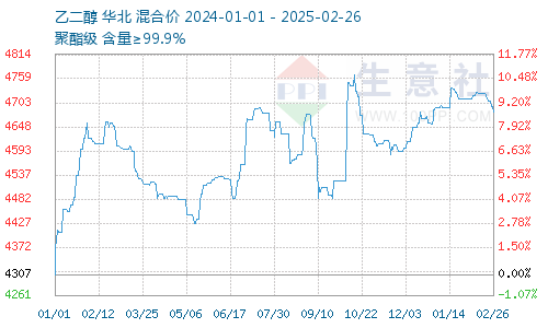 2025年2月乙二醇價格先漲后跌。據(jù)生意社數(shù)據(jù)顯示,截止2月26日,國內(nèi)油制乙二醇均價為4681.67元/噸,較2月1日乙二醇均價4711.67元/噸,下跌0.64%。