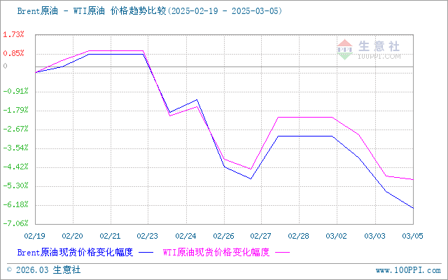 進(jìn)入本輪計(jì)價(jià)周期,國(guó)際油價(jià)行情走勢(shì)下滑,截止4日,美國(guó)WTI原油期貨主力合約結(jié)算價(jià)報(bào)68.26美元/桶,布倫特原油期貨主力合約結(jié)算價(jià)報(bào)71.04美元/桶。本周期內(nèi)原油價(jià)格走勢(shì)下滑,一方面俄烏地緣局勢(shì)緩和,美國(guó)正在考慮放松對(duì)俄羅斯制裁,潛在的供應(yīng)風(fēng)險(xiǎn)有所減弱,加之產(chǎn)油國(guó)計(jì)劃4月份開(kāi)始小幅增產(chǎn),受此消息影響國(guó)際原油行情走低;另一方面美國(guó)加征關(guān)稅,市場(chǎng)擔(dān)憂情緒加重,或?qū)⑼侠廴蚪?jīng)濟(jì)和需求預(yù)期,原油行情受影響走低。截止5日,第十個(gè)工作日原油品種變化率為-2.63%,對(duì)應(yīng)國(guó)內(nèi)汽油下調(diào)135元/噸,柴油下調(diào)130元/噸,折合每升下調(diào)92#0.10、95#0.11、0#0.11元。