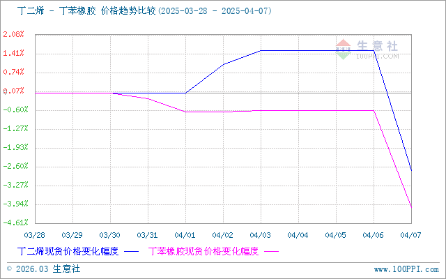 生意社丁二烯-順丁橡膠(下游產(chǎn)品)價(jià)格走勢比較圖:
