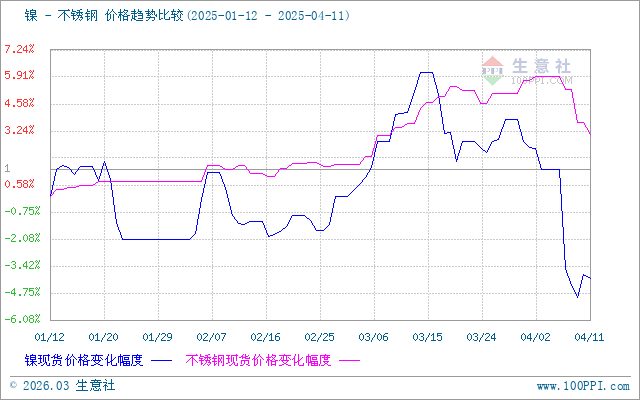 據(jù)生意社價差分析工具顯示,鎳和不銹鋼價格基本相似,現(xiàn)在價格都小幅下跌。