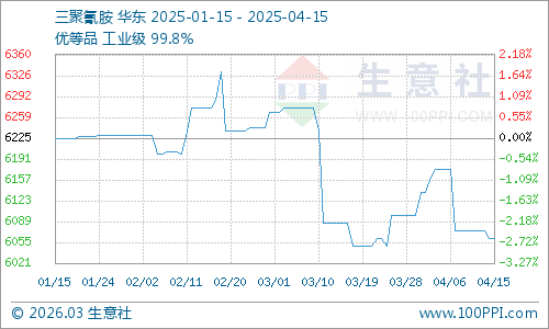生意社數(shù)據(jù)顯示,本周三聚氰胺的基準(zhǔn)價(jià)有所下降。例如,4月14日生意社三聚氰胺基準(zhǔn)價(jià)為6075.00元/噸,與本月初(6137.50元/噸)相比,下降了1.02%。而到4月15日,基準(zhǔn)價(jià)進(jìn)一步下降至6062.50元/噸。