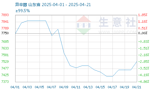 據生意社商品行情分析系統(tǒng),截止4月21日,異辛醇報價7533.33元/噸,較4月17日異辛醇價格7416.67元/噸震蕩上漲,漲幅1.57%;較4月4日異辛醇價格7850元/噸下跌,跌幅4.03%。本周異辛醇價格為21年以來最低價,異辛醇企業(yè)開工低位穩(wěn)定,異辛醇廠家供給暫穩(wěn),異辛醇價格下跌壓力減弱上漲支撐加大。增塑劑成本止跌上漲。