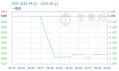 據生意社商品行情分析系統(tǒng),截止4月21日,DOP價格8159.16元/噸,較4月14日DOP價格8159.16元/噸震蕩趨穩(wěn);較4月17日DOP價格8142.50元/噸震蕩上漲,漲幅0.20%。增塑劑DOP企業(yè)開工低位趨穩(wěn),增塑劑DOP產量穩(wěn)定,苯酐價格反彈上漲,異辛醇價格止跌上漲,增塑劑DOP成本上漲,成本上漲加之供需雙弱,增塑劑上漲支撐加大下跌壓力減弱。