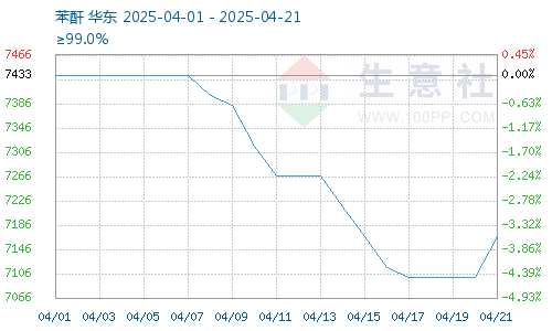 據生意社商品行情分析系統(tǒng),截止4月21日鄰法苯酐報價為7166.67元/噸,較4月17日苯酐價格7100元/噸上漲,漲幅0.94%;較4月14日苯酐價格7216.67元/噸震蕩下跌,跌幅0.69%。苯酐廠家設備開工緩慢恢復,本周下游集中采購,苯酐需求支撐仍存。增塑劑原材料成本支撐加大。