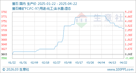 原料端:原料螢石硫酸市場延續(xù)弱勢運(yùn)行,無水氟化氫生產(chǎn)企業(yè)成本壓力有所緩解。據(jù)生意社分析系統(tǒng)顯示,截止4月22日,生意社螢石基準(zhǔn)價(jià)為3718.75元/噸,與本月初(3775.00元/噸)相比,下降了-1.49%。