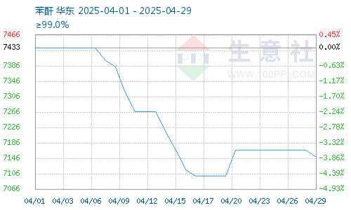 據(jù)生意社商品行情分析系統(tǒng),截止4月29日鄰法苯酐報價為7150元/噸,較4月1日苯酐價格7433.33元/噸震蕩下跌,跌幅3.81%。3月末,多家苯酐廠家停車檢修,苯酐廠家開工負(fù)荷降至5成左右,苯酐供給減少,苯酐價格大幅上漲,隨著4月苯酐企業(yè)設(shè)備開工緩慢恢復(fù),苯酐價格震蕩下跌,中下旬下游集中采購,苯酐需求支撐,苯酐價格止跌趨穩(wěn)。奈法苯酐價格強(qiáng)勢趨穩(wěn),苯酐成本支撐,苯酐價格上漲支撐仍存,苯酐價格止跌趨穩(wěn)。