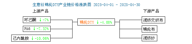2025年4月,上游原料市場價格持續(xù)下挫,下游市場多維持剛需訂單,成本端與需求端支撐均偏弱,錦綸長絲市場出貨不暢,成品庫存較高,場內(nèi)利空因素占據(jù)上風(fēng),錦綸長絲市場價格承壓下行,價格大幅走跌。