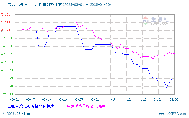 據(jù)生意社商品行情分析系統(tǒng)監(jiān)測,截止4月30日,山東地區(qū)二氯甲烷散水均價為2150元/噸,月跌幅11.34%。