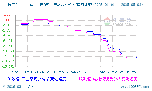 據(jù)生意社價(jià)格監(jiān)測(cè)系統(tǒng)顯示:節(jié)后碳酸鋰價(jià)格持續(xù)下探,截至5月8日,國(guó)內(nèi)工業(yè)級(jí)碳酸鋰基準(zhǔn)價(jià)66900元/噸,較節(jié)前67900元/噸下跌1.47%,較去年同期108400元/噸下跌38.28%;國(guó)內(nèi)電池級(jí)碳酸鋰基準(zhǔn)價(jià)67733元/噸,較節(jié)前68933元/噸下跌1.74%,較去年同期115400元/噸下跌41.31%。