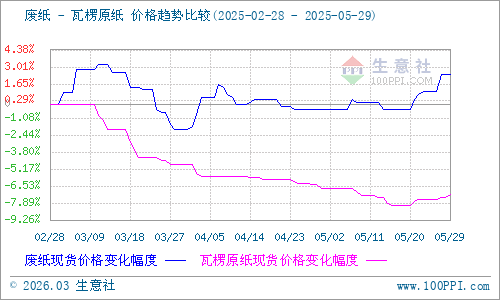 據(jù)生意社商品行情分析系統(tǒng)監(jiān)測:2025年5月瓦楞紙價(jià)格呈現(xiàn)先下滑后反彈的趨勢。5月29日瓦楞原紙140g出廠價(jià)格均價(jià)為2650元/噸,與5月1日均價(jià)相比下降了0.53%。