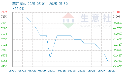 據(jù)生意社商品行情分析系統(tǒng),截止5月30日鄰法苯酐報價為6950元/噸,較5月1日苯酐價格7150元/噸震蕩下跌,跌幅2.80%。中美關(guān)稅談判,苯酐行情利好,苯酐價格短暫上漲,但苯酐需求增長不佳,苯酐企業(yè)開工恢復,苯酐企業(yè)開工率提升至7成左右,下游增塑劑需求回暖,供給增加需求回暖不及預(yù)期,苯酐價格持續(xù)下跌。