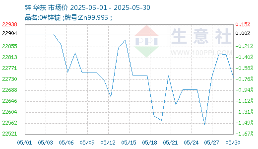 據(jù)生意社商品行情分析系統(tǒng),截止5月30日,鋅價(jià)22738元/噸,較5月1日鋅價(jià)22904元/噸下跌,跌幅0.72%。5月鋅價(jià)呈現(xiàn)頻繁波動(dòng)持續(xù)下行的趨勢(shì)。