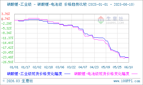 據(jù)生意社商品行情分析系統(tǒng)顯示:近期碳酸鋰價格仍處于歷史低價磨低震蕩,截至6月10日,國內電池級碳酸鋰生意社基準價60066元/噸,較年初78800元/噸下跌23.77%,較去年同期107600元/噸下跌44.15%;國內工業(yè)級碳酸鋰生意社基準價58266元/噸,較年初94000元/噸下跌38%,較去年同期103000元/噸下跌43.43%。
