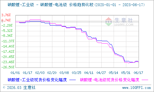 據(jù)生意社商品行情分析系統(tǒng)顯示:近日碳酸鋰價(jià)格繼續(xù)延續(xù)磨底震蕩,截至6月17日,國內(nèi)電池級碳酸鋰生意社基準(zhǔn)價(jià)60366元/噸,較上月同期63733元/噸下跌5.23%,較去年同期105400元/噸下跌42.73%;國內(nèi)工業(yè)級碳酸鋰生意社基準(zhǔn)價(jià)58566元/噸,較上月同期62466元/噸下跌6.14%,較去年同期10100元/噸下跌42%。