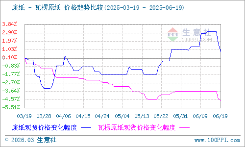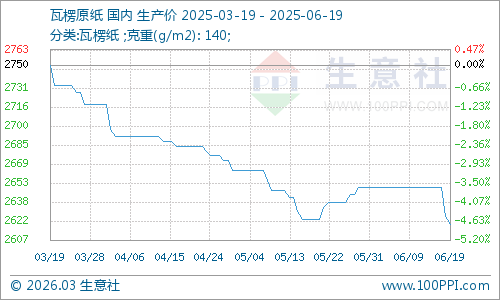 據(jù)生意社商品行情分析系統(tǒng)監(jiān)測:本周瓦楞紙價格在前期上漲平穩(wěn)之后再回下行走勢。2025年6月19日瓦楞原紙140g出廠價格均價為2620元/噸,與6月15日均價相比下降了1.13%。