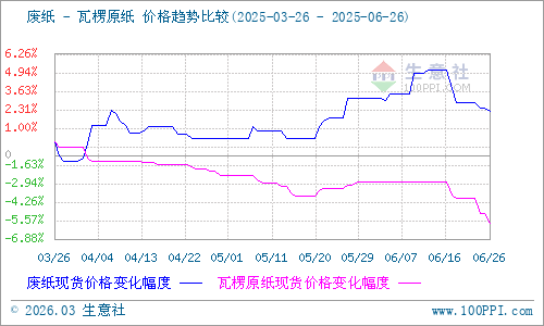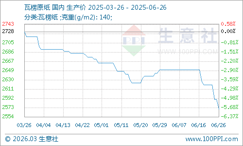 據(jù)生意社商品行情分析系統(tǒng)監(jiān)測(cè):2025年6月瓦楞紙價(jià)格在平穩(wěn)過(guò)后轉(zhuǎn)為下行走勢(shì)。6月26日瓦楞原紙140g出廠價(jià)格均價(jià)為2570元/噸,與6月1日均價(jià)相比下降了3.02%。